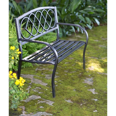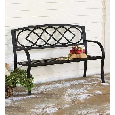 This all-weather steel-frame garden bench features a cast-iron back design with Celtic Knot pattern. The classic black finish with brushed highlights lends a timeless look to any setting. Slatted seat, curved arms and an arched back. 400 lbs limit.