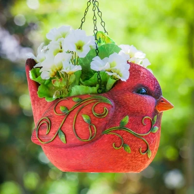 Elevate your small plant displays with this Hanging Portly Bird Planter. This charming planter features a portly red cardinal design that boasts whimsical features and intricate details. Perfect for showcasing your nature-loving personality, easily display this feathered friend in your outdoor space with the attached chain and hook. This functional and stylish decor is ideal for showcasing small plants like succulents and flowers on your porch, patio, and more. Made of polyresin, this piece has a handcrafted appeal, while its weather-resistant materials make it safe for continued outdoor use. Bring indoors during inclement weather and freezing temperatures for best results. Makes a fabulous gift for a friend or family member who loves birds.