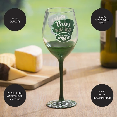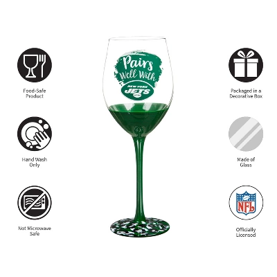 - Wine pairs well with your favorite NFL team. This decorative wine glass features the official New York Jets logo and colors. The base includes an animal print pattern that elevates the overall design.